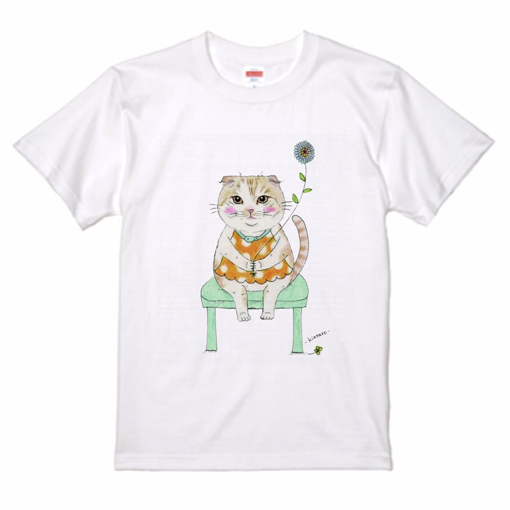 うたねこ堂の膝乗り猫、金太郎(金ちゃん)がお花を持って座っているとてもかわいいイラストです。